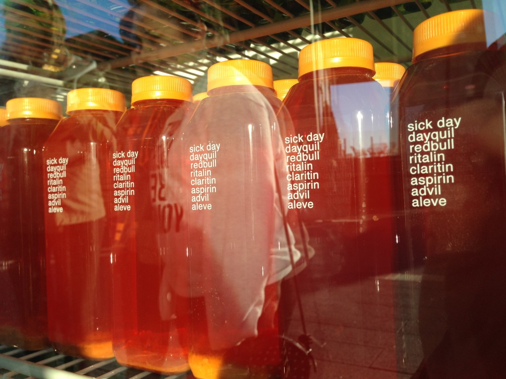 … but they are sort of conceptual poems, prepared with industrial-strength blenders, and poured into transparent, plausible beverage containers.
